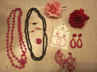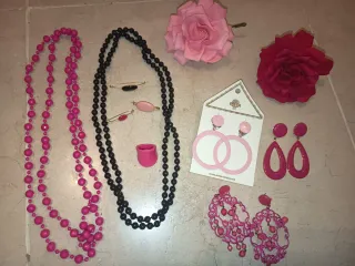 Conjunto de complementos ideales para flamenca o para dar un toque de color. - Dos collares largos, uno de cuentas rosas y otro de cuentas negras. - Tres pares de pendientes: unos grandes aros rosas, unos pendientes largos en forma de lágrima fucsia y unos pendientes largos de filigrana rosa. - Un anillo rosa. - Tres imperdibles con detalles en negro y rosa. - 2 flores