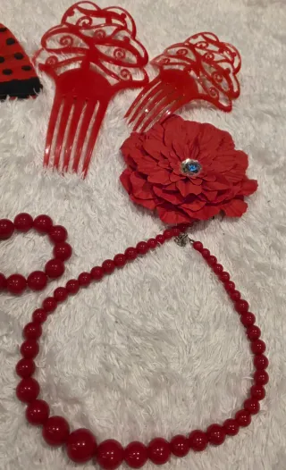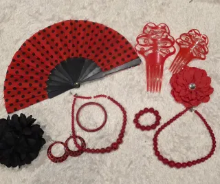 Conjunto de complementos para flamenca o sevillana. - Abanico rojo con lunares negros. - Dos peinetas rojas. - Flor roja con pedrería. - Collar de cuentas rojas. - Pulsera de cuentas rojas. - Pendientes de aro rojos. - Brazalete rojo.