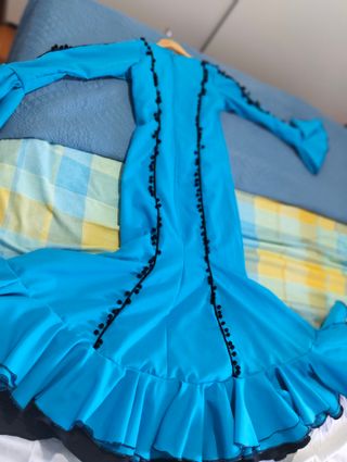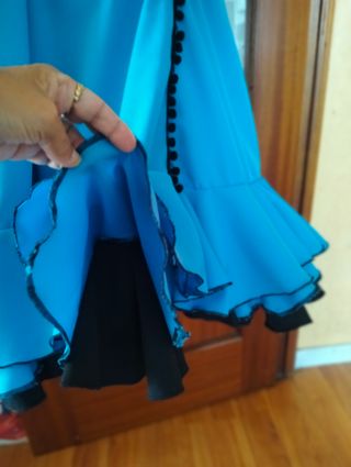 Traje de flamenca de color azul celeste con detalles en negro. Talla 38. 616244013 Tiene para sacar, regalo pendientes Lleva madroños negros, igual que el de uno de Simof - Diseño con volantes en las mangas. - Adornos de pompones negros a lo largo de la manga. - Doble capa en la falda con forro negro.