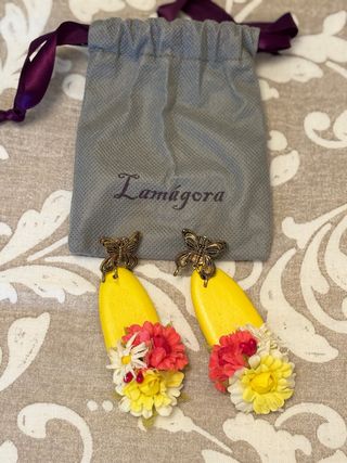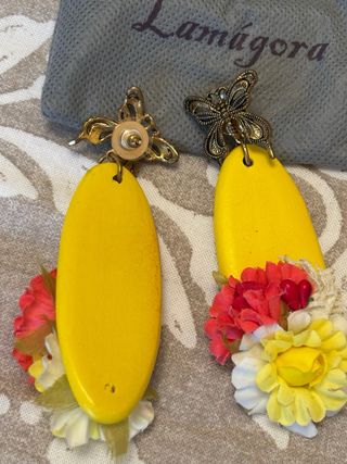 Pendientes de flamenca de la marca Lamágora, con un diseño único. - Adornados con mariposas doradas. - Detalle de flores en tonos naranjas, amarillos y blancos. - Elementos colgantes en forma de lágrima en color amarillo.