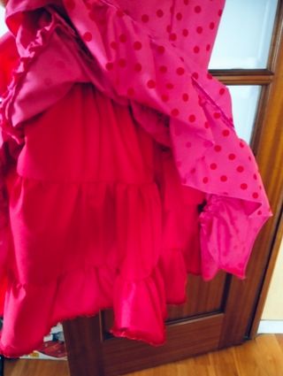 Traje de flamenca talla 34-36 Rosa rojo lunares, canastero, sin estrenar, con enaguas y bolsillo Regalo pendientes 616244013 - Color rosa con lunares rojos. - Volantes en la falda y mangas.