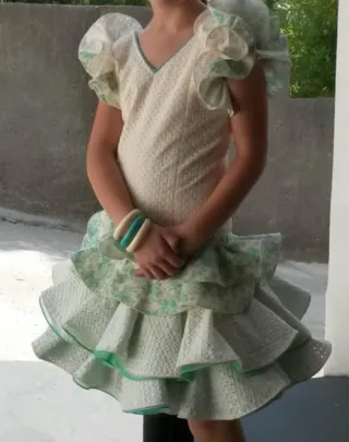 Vestido de flamenca para niña con detalles en verde y blanco. Incluye accesorios. - Mangas abullonadas con volantes. - Falda con varios volantes. - Adornado con puntilla. - Incluye pulseras a juego, pendientes y flor