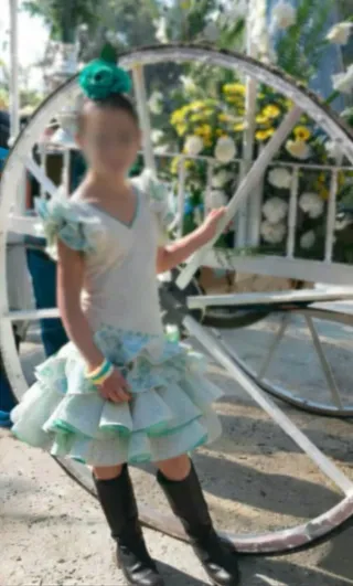 Precioso traje de flamenca para niña, como nuevo, solo tiene 2 años. Talla para niña de 4-6 años aproximadamente. Incluido en el precio pendientes, mantoncillo y flores. Medidas: 90 cm de largo, 30,5 cm de cintura.