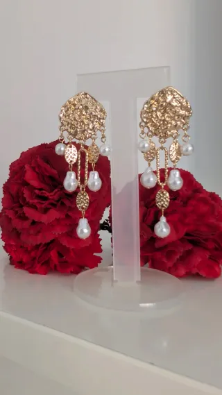 Elegantes pendientes de flamenca con un diseño único. - Detalle de pedrería y perlas. - Colgante en forma de lágrima. - Cierre de presión.