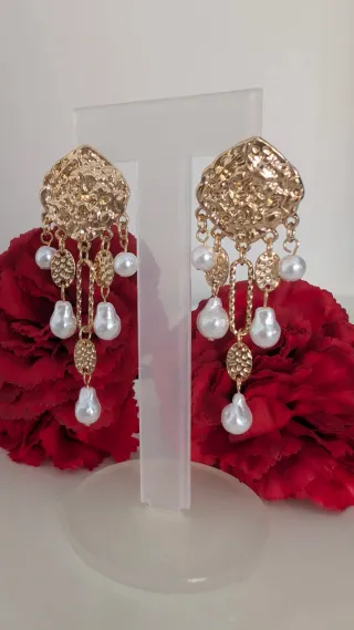 Elegantes pendientes de flamenca con un diseño único. NO PESAN NADA - Acabado dorado con detalles texturizados. - Cuelgan perlas blancas de forma asimétrica. - Diseño llamativo.