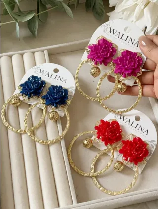 Pendientes de estilo flamenco con un diseño floral llamativo y detalles dorados. - Flores en relieve con pétalos detallados. - Aros dorados con textura. - Cuentas doradas colgantes. Disponible en todos los colores