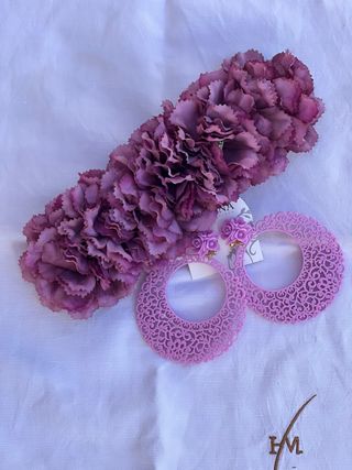 Conjunto de flamenca nuevo. Tiara de claveles y pendientes de resina. No pesan. Color malva.
