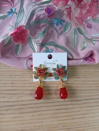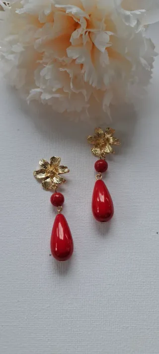 Pendientes de estilo flamenco con diseño de flor y lágrima roja. Chapado en oro
