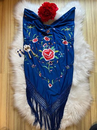 Conjunto Mantón , Pendientes y flor en azul .