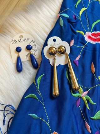 Pendientes llamativos con un diseño inspirado en la moda flamenca. - Detalle de lazo dorado. - Colgante en forma de lágrima azul. - Adorno central con pequeña piedra azul.