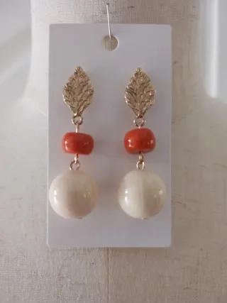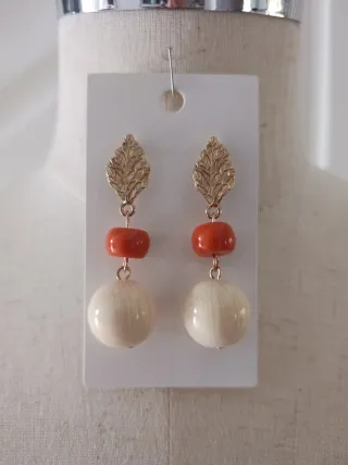 Pendientes elegantes con un diseño inspirado en la moda flamenca, perfectos para eventos especiales. - Combinación de cuentas en color coral y blanco. - Detalle dorado con forma de hoja.