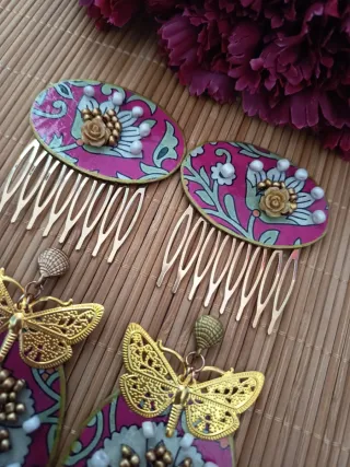 Precioso conjunto de complementos para flamenca con un diseño de mariposa. - Incluye dos pendientes y dos peinetas y broche alfiler - Adornos florales y perlas. - Colgantes con cuentas de cristal. Todo hecho a mano y no pesa nada