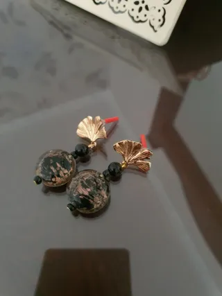 Elegantes pendientes con un diseño único. - Cuentas redondas con acabado marmoleado. - Detalle de hoja dorada. - Cierre de presión. Para flamenca o cualquier evento piedra cristal y oro viejo puedes verlo