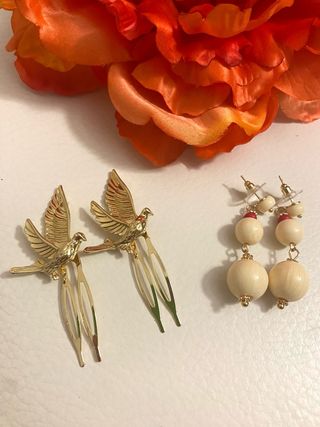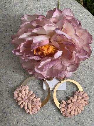Conjunto de pendientes y flor. - Pendientes con aros dorados y colgantes en forma de gota. - Flor decorativa en tono rosa.