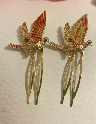 Conjunto de tres peinecillos con diseño de mariposa en color rojo y base dorada y pendiente con aro de carey y abalorios rojos - Tres unidades incluidas. - Detalle de mariposa en relieve. - Base con dientes para sujetar el cabello.
