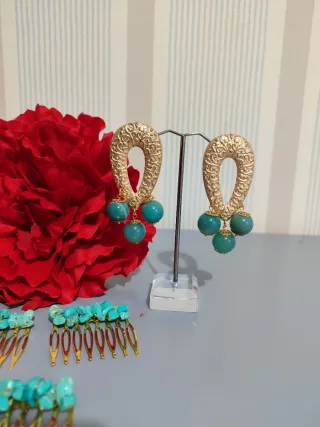 Conjunto de complementos flamencos. - Maxi Peonía Roja - Pendientes - Tres peinetas doradas adornadas con turquesas.