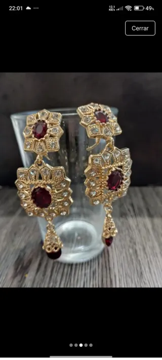 Elegantes pendientes ideales para flamenca o fiesta. - Diseño llamativo con detalles dorados. - Centros de piedra en color burdeos. - Acompañados de pequeñas piedras transparentes.