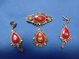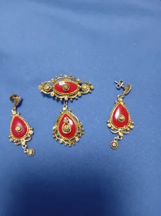 Conjunto de pendientes y broche, ideal para trajes de flamenca. El diseño es elegante y llamativo. - Pendientes colgantes con forma de lágrima. - Broche ovalado con colgante a juego. - Detalles dorados y adornos. - Elementos centrales en color rojo.