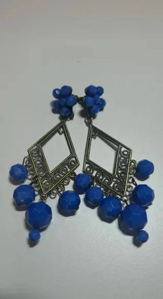 Pendientes largos con diseño llamativo, perfectos para flamenca o fiestas.,son ideales y muy ligeros. - Cuentan con detalles dorados. - Elementos centrales de cristal azul con motas blancas. - Diseño colgante con varias piezas.