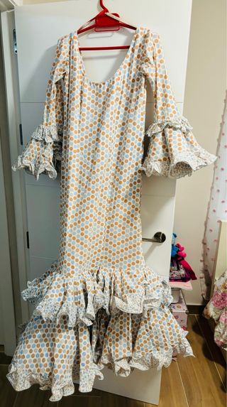 trajes de flamenca madre e hija ambos de la marca Carmen Latorre,con bolsillo interior,el grande talla 46 pero corresponde a 44, el pequeño talla 6 pero el grande,con flores y pendientes de regalo,tambie se venden por separado.
