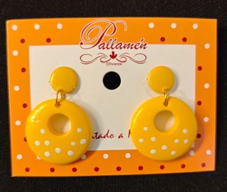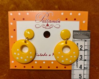 Bonitos pendientes para flamenca. Color amarillo con lunaritos en blanco . Cierre con tuerca, cómodo y seguro. No pesan.Sin estrenar.Ideal para niña.Muy originales. Pintado a mano.