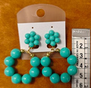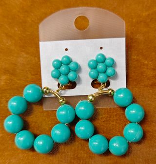 Preciosos pendientes de flamenca en color turquesa. Son dos pares de pendientes, uno más grande que el otro (De mujer y de niña) - Par grande: 6€ - Par pequeño: 4 € - Precio conjunto (los dos pares): 8€ - Diseño elegante y estilizado. - Material: Acrilico o resina (no estoy segura). - Cierre de presión.