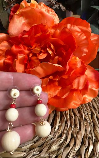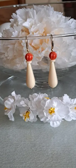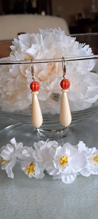 Pendientes de estilo flamenco con cuentas de coral y un colgante en forma de lágrima de hueso. - Diseño elegante y llamativo. - Combinación de colores vibrantes y neutros.