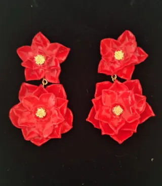 Pendientes de flamenca artesanales con un diseño de flor en color rojo y detalles dorados en el centro. Son llamativos y perfectos para complementar un traje de flamenca. Sin estrenar - Diseño de flor. - Ideal para Ferias, Romerías y eventos. - Material y diseño similar a Carmen Sanchez de Ventura. - No pesan - Color rojo vibrante. - Detalles dorados.