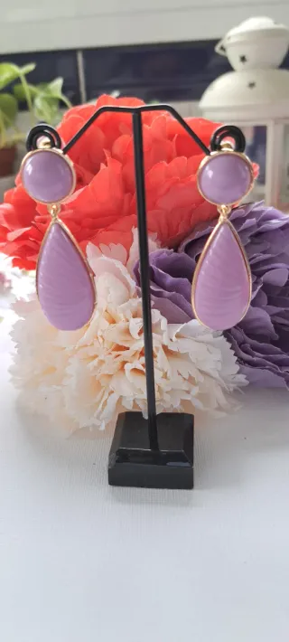 Pendientes de estilo flamenco con un diseño elegante. - Detalle de cuentas moradas. - Adorno en forma de lágrima. - Montura dorada.