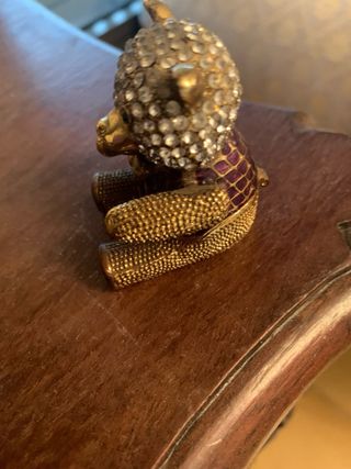 cajita joyero en forma de osito sentado, elaborada en metal esmaltado con detalles en dorado. La cabeza está decorada con cristales brillantes y los ojos en tono verde, mientras que el cuerpo luce un esmaltado púrpura con diseño geométrico. 🔸 Interior esmaltado en color amarillo. 🔸 Sistema de cierre con imán. 🔸 Medidas: 6 cm de alto x 5 cm de ancho. 🔸 Ideal para guardar anillos, pendientes o como pieza de colección decorativa.