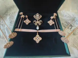 Conjunto de aderezo para fallera infantil, con un diseño elegante y detallado. - Broche principal con motivos florales. - Pendientes a juego con colgantes. - Collar de perlas con colgante. - Horquillas para el peinado.