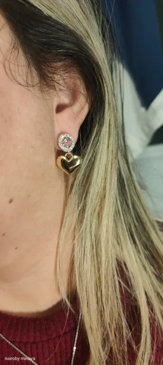 Elegantes pendientes con diseño de corazón. - Acabado en tono dorado. - Detalle de circonita rosa en la parte superior.