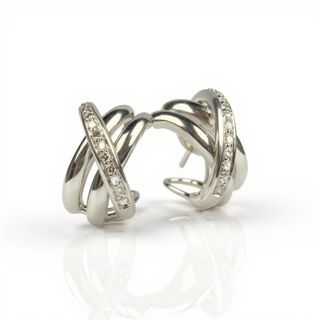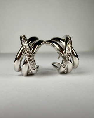 RE1878 Elegantes pendientes elaborados en oro blanco de 18 quilates, con un diseño moderno de líneas cruzadas que aporta volumen y sofisticación. Están decorados con 30 diamantes naturales de 0.02ct que añaden un brillo delicado y elegante. Cuentan con cierre omega, muy cómodo y seguro, ideal para llevar durante todo el día. PESO: 14.99g MEDIDAS: ALTO: 2 cm ANCHO: 1 cm Incluye certificado de calidad emitido por joyeria, donde se detallan los materiales y caracteristicas de la pieza.