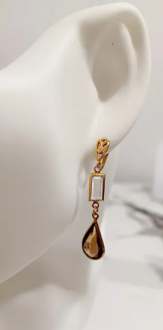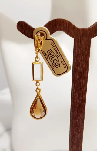 Elegantes pendientes largos 7 cm de la marca Gilco, con un diseño chapado en oro. - Colgante rectangular de cristal transparente. - Colgante inferior en forma de lágrima de cristal ámbar. - Cierre seguro.