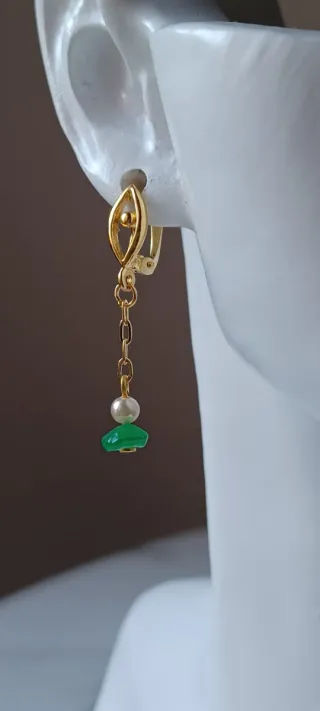 Elegantes pendientes chapados en oro con un bonito detalle colgante. - Lote de 2 a 10€ - Unidad a 6€ - Diseño con forma de ojo. - Colgante con cadena fina. - Cuentas de perla y piedra verde. - Lote de 2 pendientes.