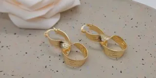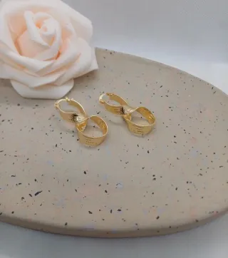 Elegantes pendientes con diseño de infinito y greca, chapados en oro de 18 quilates. - Diseño moderno y llamativo. - Acabado brillante. - Cierre seguro. No cambian de color Resistente al agua No pesan Super bonitos y super elegantes Van con cajita de regalo Hago envíos
