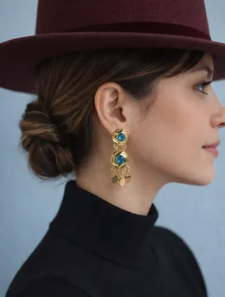 Elegantes pendientes vintage chapados en oro de 18 quilates. Cuentan con una piedra central de agua marina y detalles colgantes. - Diseño colgante con múltiples piezas. - Acabado brillante en oro. - Piedra central de color azul Hipoalergénicos No cambian de color Resistente al agua Chapado Oro 18 k No pesan Cierre catalán Van con cajita Hago envíos