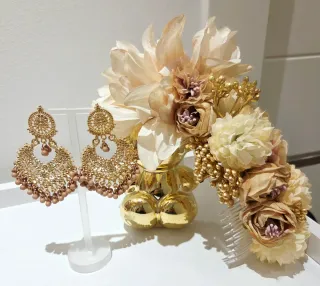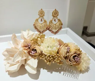 Conjunto de flamenca con pendientes y peine. - Pendientes dorados con detalles calados y cuentas. - Peine adornado con flores y cuentas doradas y beig.