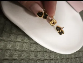 Preciosos pendientes de oro de 18 quilates con corales negros. Es un par de pendientes. - Diseño elegante con lazo. - Piedras negras de corales. - Material: oro de 18 quilates. - Se aprecian en muy buen estado.