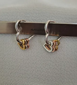 Elegantes pendientes con diseño de corazón. - Fabricados en plata. - Detalle de corazones en tonos oro y rosa.