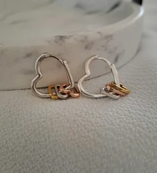 Elegantes pendientes con diseño de corazón. - Combinación de metales en oro y plata. - Cierre de aro.