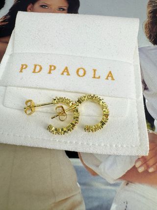 Elegantes pendientes de la marca PDPAOLA. - Diseño con detalles dorados y piedras multicolor. - Estilo moderno y sofisticado.