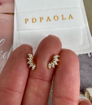 Elegantes pendientes de la marca PDPAOLA. - Diseño con detalles en forma de hoja. - Acabado en tono dorado. - Incrustaciones de cristales blancos.