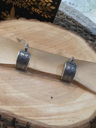 Elegantes aros de estilo étnico. - Diseño detallado con motivos ornamentales. - Acabado plateado brillante.