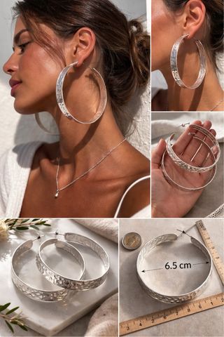Pendientes de aro muy grandes en tono plata con acabado martillado. Diseño llamativo tipo XL, muy favorecedores. Ideales para looks modernos o para elevar un outfit sencillo. En muy buen estado. Más bisutería y joyería en mi perfil.