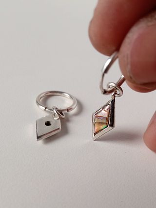 Pendientes (aros) de plata 925 con un diseño único de almaz y piedra de haliotis. Avalon para conectar con la calma. Diseño de "Almaz". Plata 925, Inserción de piedra de haliotis con reflejos iridiscentes. Alto 1,7 cm x Ancho 0,7 Peso. 0,8 gr cada colgante. Pendientes argollas de palta 925. Diametro 1,2 cm. Diseñado y elaborado en Argentina Piezas Únicas. Entrega en mano o envío certificado.