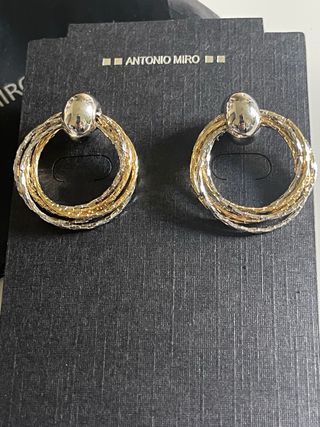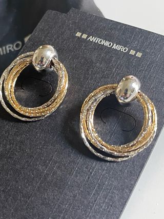 Elegantes pendientes de la marca Antonio Miró, con un diseño de aros entrelazados. NUNCA ESTRENADOS,se entregan con la protección original. - Combinación de tonos dorados y plateados. - Diseño moderno y versátil.