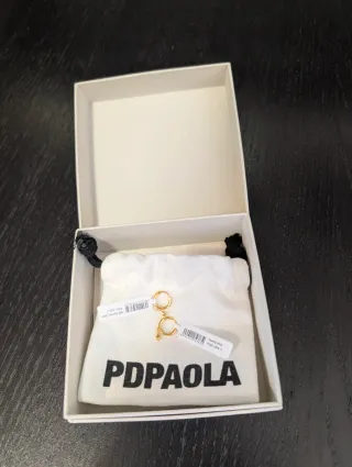 Elegantes pendientes de la marca PDPAOLA. - Diseño en dorado. - Plata bañada en oro. - Aros pequeños con detalle lágrima - Incluye su bolsa original de la marca y caja de regalo. No están estrenados, pero no puedo cambiarlo por qué está fuera de plazo la devolución