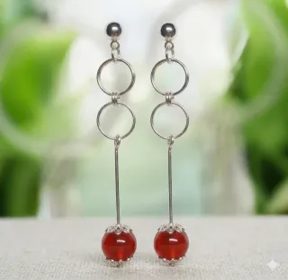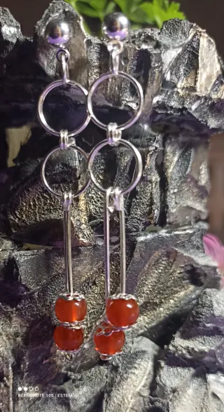 Elegantes pendientes largos con minerales de cornalina roja y detalles plateados. Baño de plata - Diseño colgante con 2 aros. - Cuentas de cornalina natural. - Cierre de presión. Diseño exclusivo. Aleja la negatividad con estos pendientes