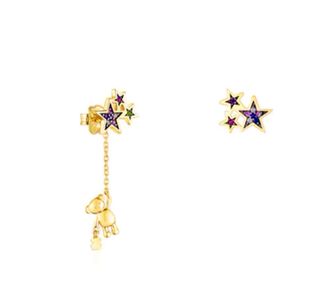 Pendientes Tous con baño de oro de 18 kt sobre plata de ley y piedras colores. - Diseño de estrellas con gemas. - Colgante de osito en uno de los pendientes, como un charm, desmontable. - Estilo corto/largo. Puedes ponerlos sin el osito que cuelga o con él, o usarlo como colgante etc. Precio en tienda 129... no ofertas absurdas. Con su caja bolsita etc nuevo todo.